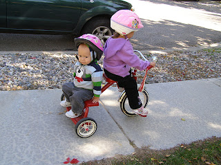 Michaela finally had legs long enough to ride the tricycle she got last Christmas - and she took her brother along for the ride!
